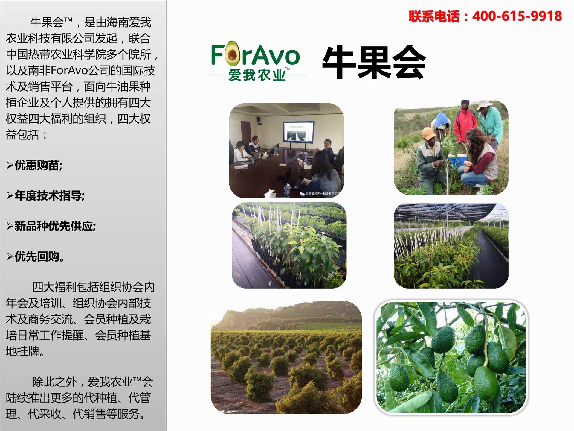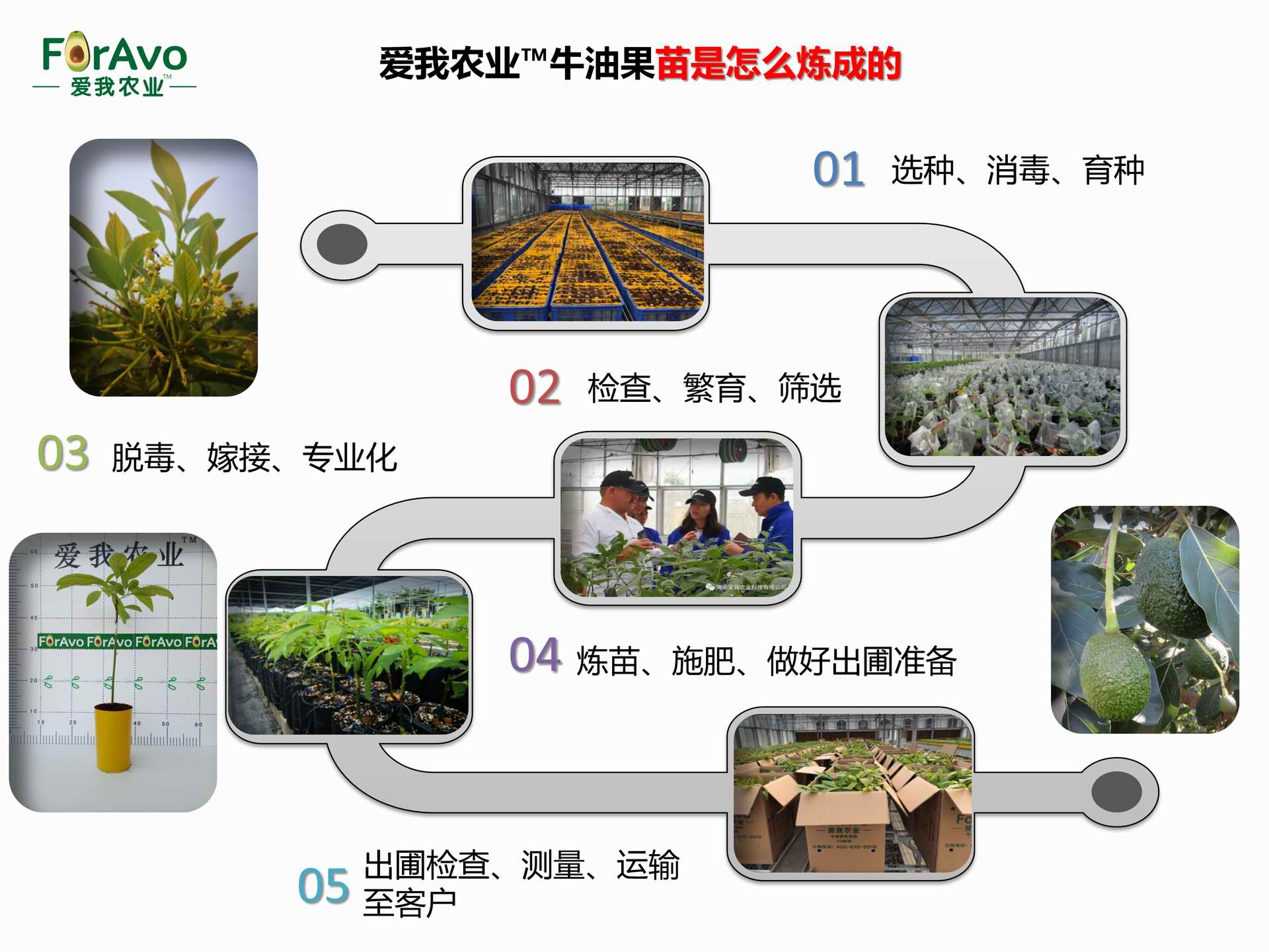 海南愛我農業科技有限公司是一家綜合性的高科技農業發展企業,旗下愛我農業TM致力于打造中國最大最強的牛油果種植企業。依托美國、南非、澳大利亞等擁有百年牛油果繁育、種植歷史以及產業鏈市場的優勢,開展牛油果種苗繁育、種植技術,種植加盟、深加工等產業。結合中國市場,面向廣大苗圃基地、種植農場、合作加工等企業,推出的適合規模化、標準化的牛油果全產業鏈服務。 Hainan Foravo Agricultural Technology Co., Ltd. is a comprehensive high-tech agricultural development enterprise , dedicated to building the largest and most powerful avocado plantation enterprise in China. Relying on the advantage of avocado nursery, planting history, and the industrial chain over 100 years in the United States, South Africa, Australia, we are carrying out nursery, planting, proce...